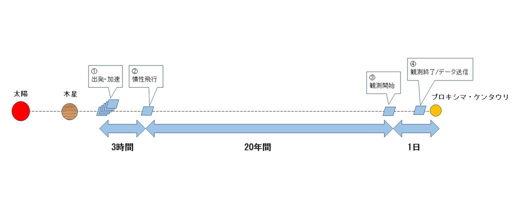探査機は約20年間慣性飛行を行い、半年に一度レーザー発振基地から発射されるレーザー光線により電力供給が行われ、