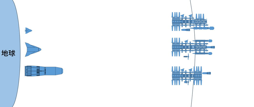 | <輸送システムの体系> ■旅客輸送 ・8人乗りシャトル : 再利用型ロケットで単独、またはHeavy-Lifterの背中に乗せられて打ち上げされる。少人数用。 ・100人乗りシャトル : 再利用型ブースターを使用し単独で打ち上げされる。100人程度の旅客/貨物輸送兼用。 ■貨物輸送 ・Heavy-Lifter : 1,000トン~2,000トンの貨物を低コストで大量輸送する。単段式の再利用型ロケット。 |