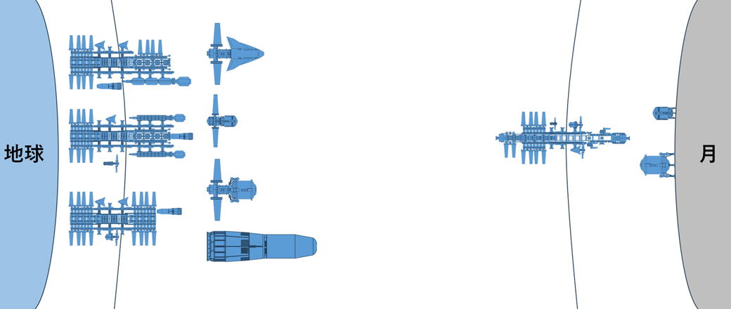 | <輸送システムの体系> ■旅客輸送 ・100人乗りシャトル : VASMIR推進ユニットを連結して、地球周回軌道と月周回軌道のプラットフォーム間を連絡する。 ・50人乗り地球/月間連絡船 : VASMIR推進ユニットを連結して月周回軌道に向かい、上部の着陸船のみを使用し月への離着陸を行う。 ■貨物輸送 ・重量物輸送用カーゴモジュール : 地球/月の周回軌道間はVASMIR推進ユニットを使用し、月への離着陸は上部の着陸ユニットを使用する。 ・Heavy-Lifter : 1,000~2,000トンの貨物を地球周回軌道から月へと輸送、または月から地球周回軌道へ輸送する。 |