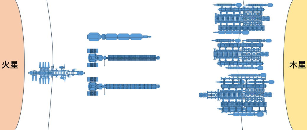 地球/火星間よりもさらに遠距離であるため、時間短縮と大量輸送のために核融合推進システムを使用した宇宙船が主流となっています。