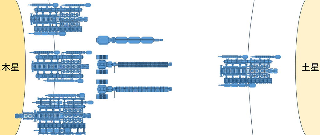 | <輸送システム体系> ■旅客輸送 ・惑星間定期連絡船 : 核融合推進システムを使用し、木星/土星の周回軌道間を2~3か月で連絡し400人程度の乗客を輸送する。 ■貨物輸送 ・標準型コンテナ輸送船 : 核融合推進システムを使用し、50トン標準型コンテナを100個~300個輸送する。 ・核融合燃料輸送用タンカー : 核融合推進システムを使用し、水素/ヘリウム3標準型カートリッジを100個~150個輸送する |
